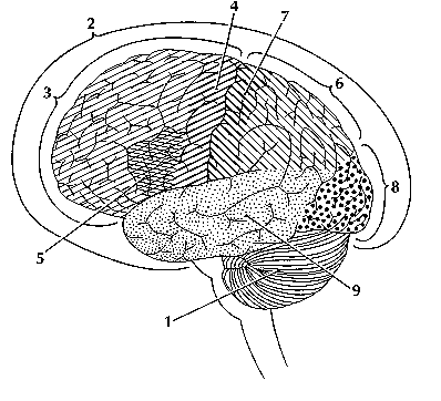 <top> The Geography of Thought Each cerebral hemisphere can be divided into sections, or lobes, each of which specializes in different functions. To understand each lobe and its specialty we will take a tour of the cerebral hemispheres, starting with the two frontal lobes (3), which lie directly behind the forehead. When you plan a schedule, imagine the future, or use reasoned arguments, these two lobes do much of the work. One of the ways the frontal lobes seem to do these things is by acting as short-term storage sites, allowing one idea to be kept in mind while other ideas are considered. In the rearmost portion of each frontal lobe is a motor area (4), which helps control voluntary movement. A nearby place on the left frontal lobe called Broca’s area (5) allows thoughts to be transformed into words. When you enjoy a good meal—the taste, aroma, and texture of the food—two sections behind the frontal lobes called the parietal lobes (6) are at work. The forward parts of these lobes, just behind the motor areas, are the primary sensory areas (7). These areas receive information about temperature, taste, touch, and movement from the rest of the body. Reading and arithmetic are also functions in the repertoire of each parietal lobe. As you look at the words and pictures on this page, two areas at the back of the brain are at work. These lobes, called the occipital lobes (8), process images from the eyes and link that information with images stored in memory. Damage to the occipital lobes can cause blindness. The last lobes on our tour of the cerebral hemispheres are the temporal lobes (9), which lie in front of the visual areas and nest under the parietal and frontal lobes. Whether you appreciate symphonies or rock music, your brain responds through the activity of these lobes. At the top of each temporal lobe is an area responsible for receiving information from the ears. The underside of each temporal lobe plays a crucial role in forming and retrieving memories, including those associated with music. Other parts of this lobe seem to integrate memories and sensations of taste, sound, sight, and touch. <top> The Cerebral Cortex Coating the surface of the cerebrum and the cerebellum is a vital layer of tissue the thickness of a stack of two or three dimes. It is called the cortex, from the Latin word for bark. Most of the actual information processing in the brain takes place in the cerebral cortex. When people talk about "gray matter" in the brain they are talking about this thin rind. The cortex is gray because nerves in this area lack the insulation that makes most other parts of the brain appear to be white. The folds in the brain add to its surface area and therefore increase the amount of gray matter and the quantity of information that can be processed. <top> The Inner Brain Deep within the brain, hidden from view, lie structures that are the gatekeepers between the spinal cord and the cerebral hemispheres. These structures not only determine our emotional state, they also modify our perceptions and responses depending on that state, and allow us to initiate movements that you make without thinking about them. Like the lobes in the cerebral hemispheres, the structures described below come in pairs: each is duplicated in the opposite half of the brain. The hypothalamus (10), about the size of a pearl, directs a multitude of important functions. It wakes you up in the morning, and gets the adrenaline flowing during a test or job interview. The hypothalamus is also an important emotional center, controlling the molecules that make you feel exhilarated, angry, or unhappy. Near the hypothalamus lies the thalamus (11), a major clearinghouse for information going to and from the spinal cord and the cerebrum. An arching tract of nerve cells leads from the hypothalamus and the thalamus to the hippocampus (12). This tiny nub acts as a memory indexer—sending memories out to the appropriate part of the cerebral hemisphere for long-term storage and retrieving them when necessary. The basal ganglia (not shown) are clusters of nerve cells surrounding the thalamus. They are responsible for initiating and integrating movements. Parkinson’s disease, which results in tremors, rigidity, and a stiff, shuffling walk, is a disease of nerve cells that lead into the basal ganglia.